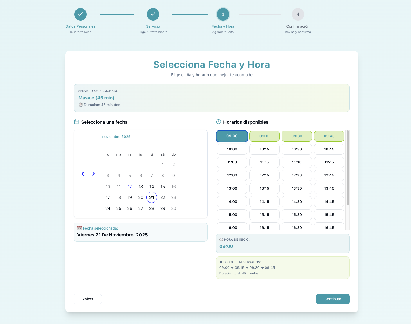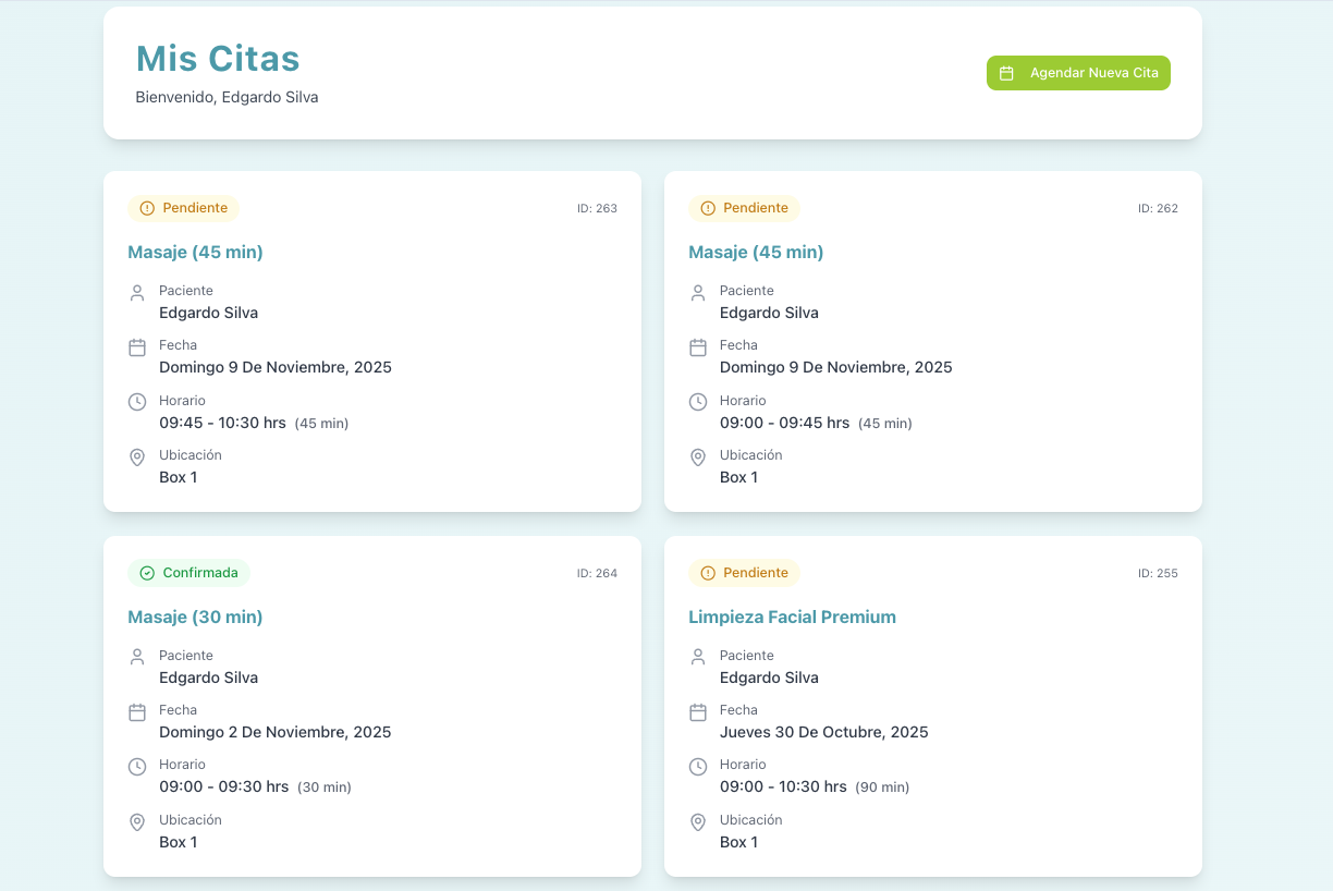 Sistema completo de gestión de citas para centro de kinesiología estética. Incluye autenticación JWT, flujo de reserva multi-paso, confirmación por email y panel administrativo.