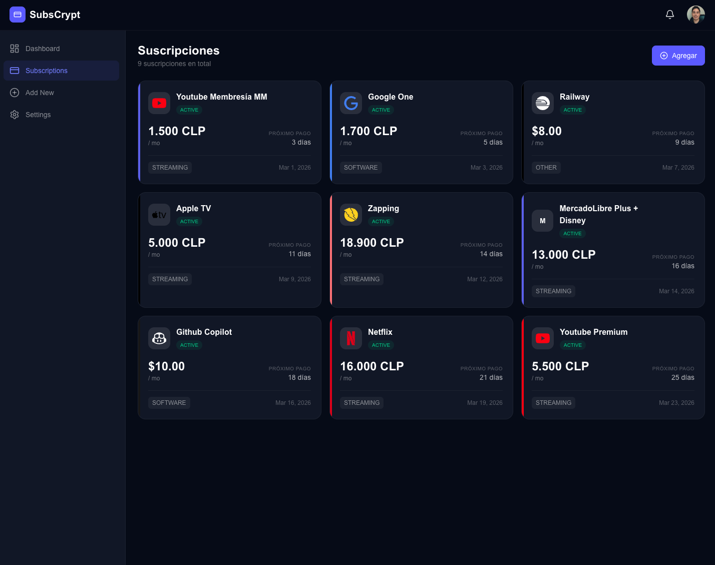 Web app para gestionar suscripciones digitales. Visualiza gastos mensuales y anuales, detecta logos automáticamente y recibe alertas antes de cada cobro.